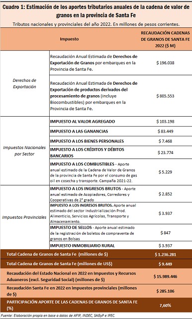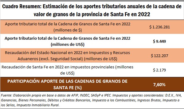 El presente trabajo tuvo como objetivo estimar el valor total de los aportes tributarios anuales que realiza la cadena de valor de granos de la provincia de Santa Fe, tanto en lo relativo a impuestos nacionales como provinciales, para el año 2022.