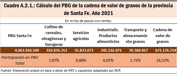 Asimismo, para obtener la parte de la recaudación nacional generada por la provincia que correspondería a la cadena de valor de granos se debieron realizar supuestos utilizando datos del PBG, a partir de los cuales se construyó un indicador, presentado en el Cuadro A.2.1, al que se referenció como “PBG Cadena de Valor de Granos de Santa Fe”. Este indicador es una aproximación a la participación que tiene dicha cadena en el producto total santefecino. El mismo se calculó a partir de la sumatoria de los PBG sectoriales de las siguientes categorías: