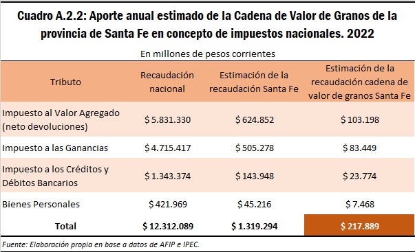 El Cuadro A.2.2 muestra la recaudación de 2022 publicada por AFIP de cada impuesto nacional considerado en el análisis, y a partir de dicho valor se calculó primero la proporción que habría tributado el total de la provincia de Santa Fe, y con ese dato multiplicado por el PBG de la Cadena de Granos de Santa Fe del Cuadro A.2.2 se llegó a lo que aportaría dicha cadena.