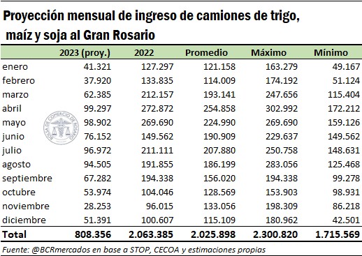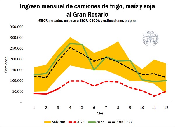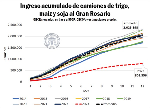Además, en base a todo lo expuesto, el 2023 va camino a terminar el año con un acumulado de apenas 808.000 camiones de trigo, maíz y soja arribados a los puertos y plantas de la región, un 60% menos que el 2022 y que el promedio de la última década. Asimismo, si se compara con los otros dos años en que la producción fue afectada por sequías (2014 y 2018) la proyección queda aún muy lejos de ese entonces: 1.715.000 camiones arribados en 2014 y 1.765.000 en 2016.
