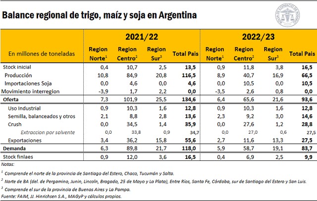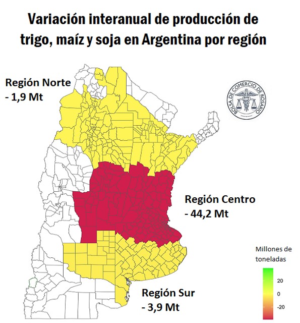 En el siguiente cuadro se presenta el balance regional del trigo, maíz y soja consolidados en Argentina. Tal como se puede apreciar, tanto la caída en las exportaciones proyectadas como la caída en el procesamiento de soja proyectado son mucho mayores en la región de influencia del Gran Rosario que en los puertos del sur de Buenos Aires.