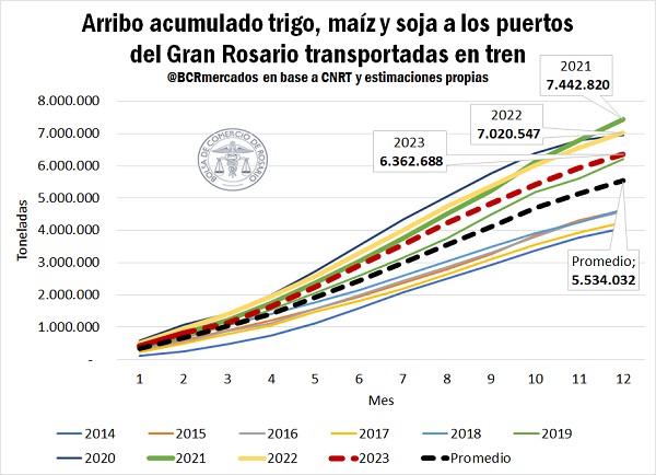 Por su parte, el transporte de granos por tren hasta las terminales del Gran Rosario sortearía relativamente mejor la estocada, aunque no exenta de ajustes. Se proyecta que el total de trigo, maíz y soja que arribará a los puertos y plantas de la zona por esta vía alcance 6,36 Mt, sólo un 10% menos que el 2022 y quedando incluso por encima del promedio de la última década (5,5 Mt). Es que el tren fue ganando espacio como medio de transporte de granos en los últimos años, particularmente desde 2019 en adelante.