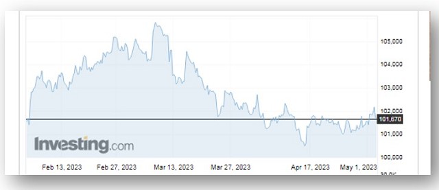 Como vemos en el gráfico (dólar índice), el valor de esta divisa venía en baja desde inicios de marzo, algo favorable para los precios de la soja y demás commodities agrícolas.