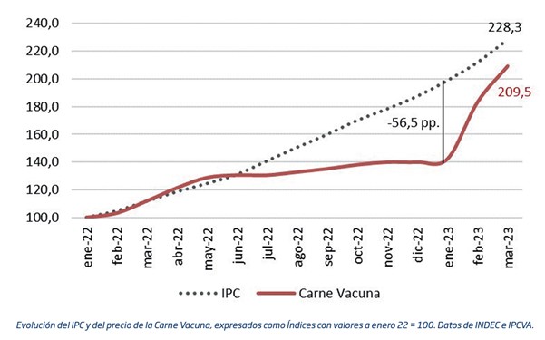 Sin embargo, el año pasado, durante todo el segundo semestre el precio de la carne vacuna fue ajustando por debajo del aumento general registrado por el resto de los bienes y servicios, llegando a acumular un retraso de más de 56 puntos porcentuales contra inflación, a inicios de este año.