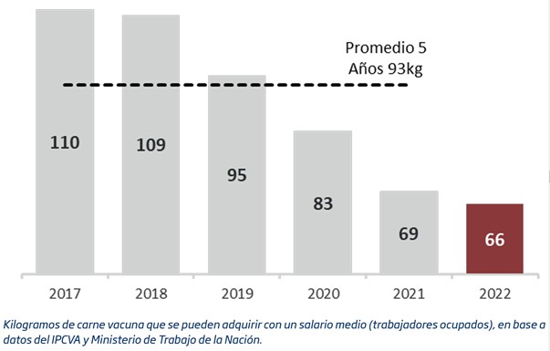 Si medimos la cantidad de kilos de carne que se puede comprar con un ingreso medio en Argentina, vemos un claro deterioro año tras año. En 2022, con datos disponibles por el Ministerio de Trabajo hasta el 3er trimestre del año, con un ingreso medio se podía comprar 66 kilos de carne vacuna al mes, un 30% menos de lo que permitía este mismo ingreso en 2019.
