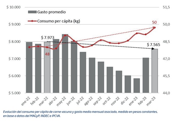 Actualmente, según los datos publicados por el Ministerio de Agricultura y Ganadería, se consume en términos per cápita un 3,6% más de carne vacuna (49,7kg vs 48,1 kg/hab/año) en relación a un año atrás mientras que, que el gasto promedio -medido en pesos constantes- se contrajo en un 5,1% estimándose actualmente en $7.565 por habitante por mes.