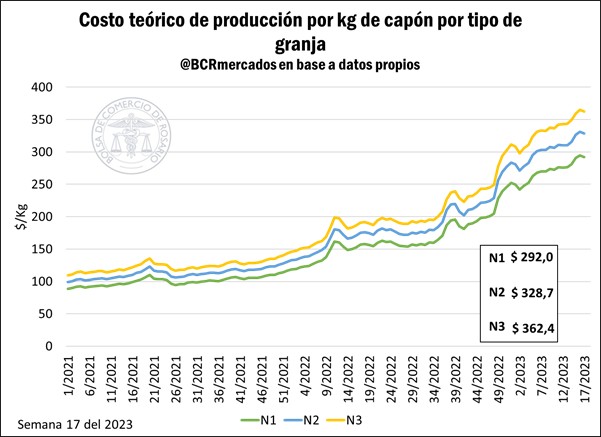• Evolución de los costos de producción de cerdos: Los costos de las granjas cortaron con su tendencia al alza en la última semana, producto principalmente de la caída en el precio del maíz. Para la semana 17 del 2023, los valores promedios de las granjas N1 fueron de $ 292 por kilogramo de capón, para los establecimientos N2 de $ 328,7 /kg y para las N3 de $ 362,4 /kg, encontrándose alrededor de un 4% por encima de los costos un mes atrás.