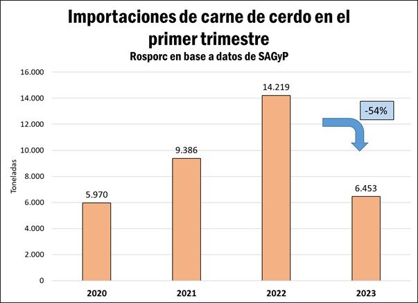 Amén de un incremento en las exportaciones en lo que va de 2023, que alcanzaron las 3.400 toneladas en el período (+ 77%), la mejora de la balanza se debió principalmente a una fuerte caída en las importaciones. En total, en el primer trimestre se importaron 6.400 toneladas de carne porcina, una caída del 54% en relación con el mismo período del año previo.