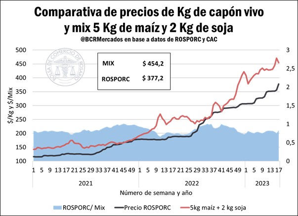 • “Mix 5 kg de maíz + 2 kg de soja”: la recuperación en el precio del capón, junto con el descenso en el precio del maíz en el mercado interno, achicaron la brecha entre el capón y el mix. El capón alcanzó en la semana 17 un precio que representó el 83% del valor del mix, el mayor ratio en lo que va de 2023. El valor del mix se ubicó en $ 454,2 en la última semana, mientras que el kilo de cerdo vivo se ubicó en $ 377,2/kg; esto deriva en un “retraso teórico” de más de $ 77/kg en el valor de los cerdos locales.