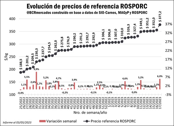 El Precio de Referencia para los capones negociados en ROSPORC durante la semana del 17 al 23 de abril alcanzó un valor de $ 377,2/kg, implicando una suba del 6% con respecto a la semana previa y un incremento del 100% respecto a la misma semana del año previo.