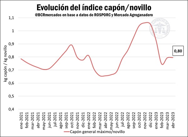 • Índice Capón/Novillo: Luego de un final de 2022 en el que el precio del capón llegó a superar al precio del novillo (considerando los promedios mensuales de noviembre y diciembre), esta relación sintió una corrección en los primeros meses de 2023 en favor de los bovinos. La fuerte suba en el precio del novillo en enero (+15%), pero fundamentalmente el salto de febrero (+32%), devolvieron a la relación por debajo de la unidad. En los meses de marzo y abril, la relativa estabilidad en el precio del novillo permitió una tímida ganancia de posición del capón, que cierra el mes con un promedio del 0,80 en relación con el novillo.