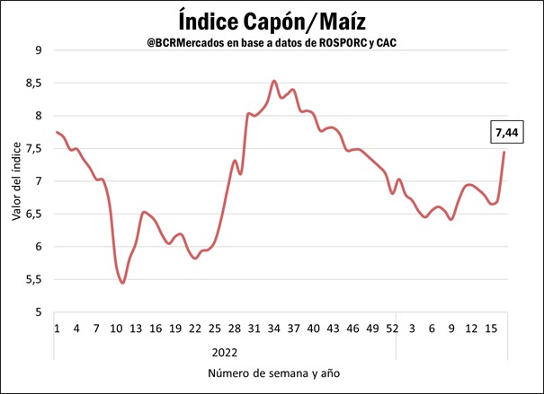 • Índice Capón/Maíz: en las últimas semanas pudimos ver una recuperación en este ratio, producto de una marcada caída en los precios del maíz en el mercado interno, con un precio del capón que mostró una recomposición en el mismo período. El valor del índice Capón/Maíz alcanzó un valor de 7,44 para la doceava semana del año, el mayor valor desde noviembre de 2022.