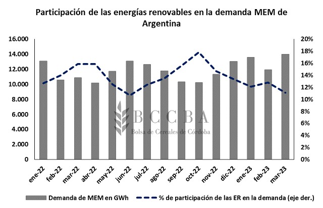 Las energías renovables están teniendo una mayor participación en el escenario energético argentino, las cuales ya abastecen el 14% de la demanda del Mercado Eléctrico Mayorista (MEM) de acuerdo a datos de la Compañía Administradora del Mercado Mayorista Eléctrico Sociedad Anónima (CAMMESA). Para considerar la magnitud de este dato, se destaca que el MEM abastece el 93% de la demanda del sistema eléctrico argentino, el sistema patagónico cubre el 6%, y los pequeños sistemas aislados el 1% restante. En detalle, la participación mensual rondó entre el 12% y 18%, siendo el mes de octubre el que alcanzó el valor más alto y junio el más bajo.