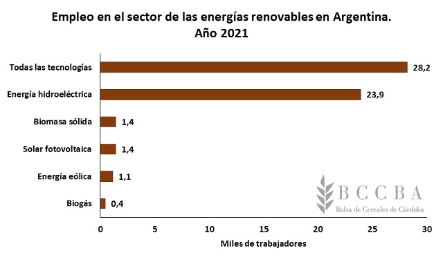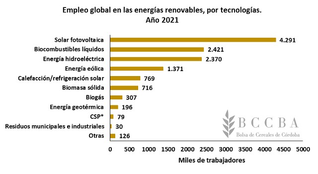 En el último informe sobre energías renovables y empleos de la International Renewable Energy Agency (IRENA), se estimó que en 2021 se emplearon 12,7 millones de trabajadores en el mundo distribuidas como se muestra en el grafico posterior. La energía solar fotovoltaica es la que mayor participación tiene en el total, un 34%. Por su parte, los trabajadores dedicados a las actividades de biogás representan un 2% mundial.