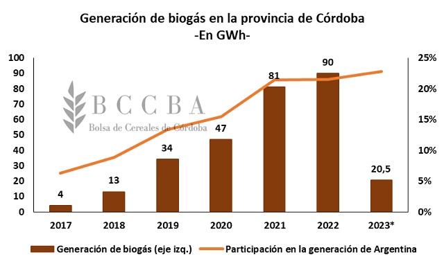 En particular, la provincia de Córdoba, desde el año 2017 ha comenzado a producir en cantidades más importantes. La participación de la provincia fue aumentando con el paso del tiempo, hasta posicionar en un 22% de la generación total del país en 2022. Con respecto al primer bimestre del año 2023 se han generado en Córdoba 20,5 GWh de biogás, correspondiente a una producción de 6,8 GWh para el mes de enero, 6,1 GWh para el mes de febrero y 7,7 GWh en marzo. En comparación con el primer trimestre del 2022 solo disminuyó la actividad en un 1%.