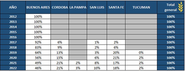 Esta se posiciona como la segunda provincia productora, ya que en primer lugar se encuentra Buenos Aires con 46% de participación en el total de la producción, que se traducen en 190 GWh de producción de biogás durante el 2022, mientras que en tercer puesto se encuentra Santa Fe con 18% de participación, es decir unos 76 GWh. En la siguiente tabla se muestra el avance provincial en la participación de producción de biogás en Argentina. La provincia de Buenos Aires ha ido perdiendo terreno, avanzando así Córdoba, Santa Fe y en menor medida provincias como San Luis, La Pampa y Tucumán.