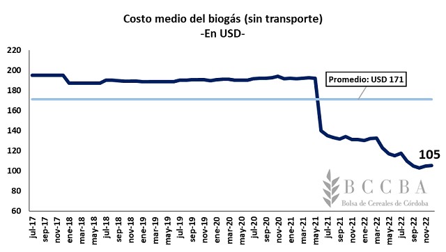 Según los datos relevados por CAMMESA, se observa que el costo medio del biogás, que se define como el cociente entre la suma de los costos representativos de la producción ya sean propios y/o asociados y la energía total generada en un periodo, ha ido disminuyendo con el paso del tiempo. En particular, en el mes de junio de 2021 hay una gran disminución de los costos, pasando de USD 192 a USD 140 dado un aumento en la cantidad de GWh generados, el cual pasó de 7,2 GWh en mayo a 11,2 GWh a junio de ese año.
