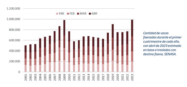 Tomando este último dato como referencia de faena, en los primeros cuatro meses del año el total de vacas sacrificadas ascendería a 988.500, unas 220.000 vacas más que las registradas en igual período un año atrás.