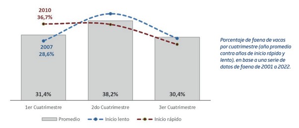 Analizando la misma serie temporal de 22 años (2001 a 2022) obtenemos que la faena del primer cuatrimestre del año explica, en promedio, el 31,4% de la faena anual. Bajo el mismo criterio, el mínimo de la serie para este cuatrimestre explica el 28,6% de la faena anual, señando un año que se inicia con una faena lenta (2007) que luego se acelera ligeramente por sobre su ritmo estacional, hacia el segundo cuatrimestre del año. En tanto que el máximo de la serie para este mismo cuatrimestre se observa en 2010, con una faena que se inicia a un ritmo muy rápido explicando el 36,7% de lo que finalmente termina siendo el número de procesamiento anual. En el caso de aquel año, la faena de vacas continuó durante los primeros meses con la misma inercia de liquidación de los ciclos previos hasta tanto comenzó a testear la escasez generada por la liquidación, impulsando así un cambio en la fase ganadera que favoreció la retención.