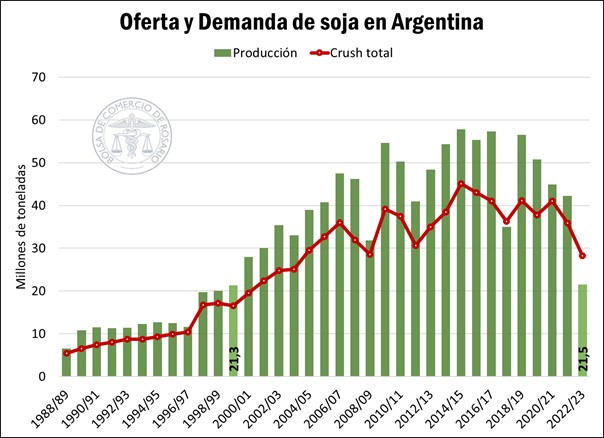 En su último informe mensual, GEA/BCR recortó la estimación de cosecha de soja 2022/23 a 21,5 millones de toneladas, la producción más baja desde la campaña desde la campaña 1999/00. Entre medio, se llegó casi a triplicar el volumen productivo, aunque hace tiempo la producción de soja está estancada en Argentina