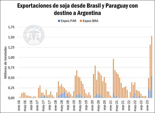 Sólo en el mes de abril, las exportaciones de soja desde Brasil con destino a Argentina superaron el medio millón de toneladas, en tanto que desde Paraguay se despacharon otro millón más. Independientemente que estas cifras puedan no coincidir con las importaciones argentinas el mismo mes calendario por una cuestión de temporalidad, da cuenta del impulso que muestra la actividad, que en términos acumulados registró el mayor movimiento internacional de granos para esta categoría en la historia.