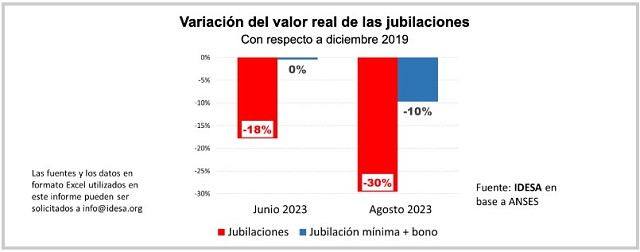 Asumiendo que la inflación se mantiene en 8% mensual, en agosto del 2023 las jubilaciones serán un 30% inferior y la mínima un 10% inferior a diciembre del 2019.