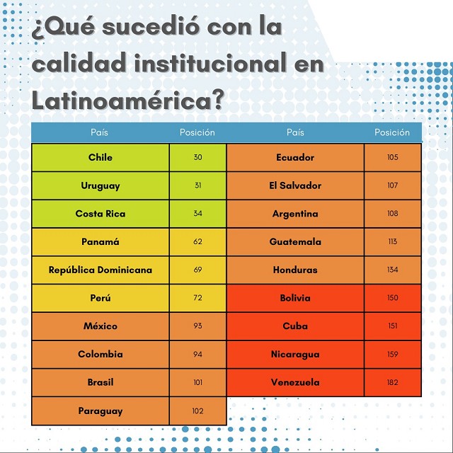 A nivel latinoamericano República Dominicana, Costa Rica, Ecuador y Argentina registran mejoras en su calidad institucional. Los mayores retrocesos los presentan Nicaragua, Chile y El Salvador. Chile sigue liderando la región, pero tiene su mayor retroceso desde el inicio del índice con una caída de seis posiciones.