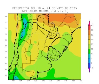• Solamente, la mayor parte del cinturón maicero observará temperaturas máximas superiores a 20°C, con algunos focos con valores mayores.