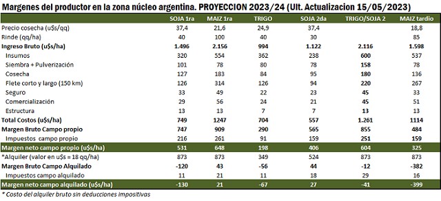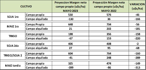 Vale aclarar que todos los cultivos presentan una caída en sus márgenes. El dato sale de comparar los márgenes netos de mayo 2022 con la proyección de márgenes al 15 de mayo de 2023 para la campaña 2023/24. En campo propio la rotación trigo/soja 2° es la que más cayó, con -160 u$/ha. En campo alquilado el cultivo que experimentó la mayor variación negativa fue el maíz tardío (-313 u$/ha) seguido por la rotación trigo/soja de 2°(-289 u$/ha).