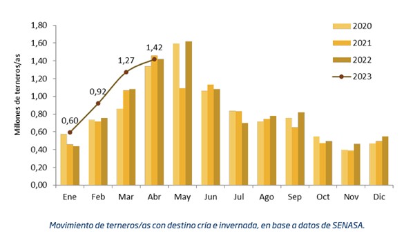 Más allá del resto de categorías que coyunturalmente pueden seguir alimentando fuertemente la oferta para los corrales en los próximos dos a tres próximos meses, la elevada participación de terneros y terneras en los encierres totales (45%) puede estar marcando detrás de estos indicadores de menor reposición un comienzo de declinación de la zafra. Una zafra que, como venimos mencionando, este año ha tenido una salida más adelantada producto de la seca y que, consecuentemente, debería tender a agotarse más rápidamente. Parte de esta moderación en el ritmo de salida de terneros ya se ha empezado a ver en los movimientos de abril con 1,42 millones de terneros/ as saliendo de los campos, volumen muy similar al registrado en los últimos tres años.