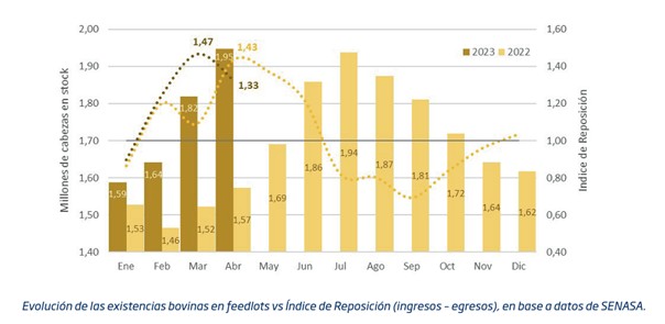 Sin embargo, los mismos datos provistos por SENASA muestran para el mes de abril un índice de reposición que, aún en fase de ‘fase de llenado’, comienza a curvar su trayectoria. De acuerdo a los datos informados, durante abril los feedlots recibieron un total de 520.135 vacunos mientras que durante el mismo período salieron 391.898 animales; este movimiento de ingresos sobre egresos es el que origina este Índice de Reposición del 133% en abril. Es decir, si bien la cantidad de animales que ingresan sigue siendo superior a la cantidad de animales que egresan de los corrales, el ritmo de llenado comienza a desacelerarse, siendo 14 puntos inferior al registrado un mes atrás.