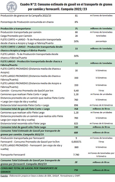 Del modelo se llega a la estimación de que el transporte de granos consumiría en la campaña 2022/2023 unos 724 millones de litros de gasoil. El 96% de dicho consumo sería realizado por camiones, mientras que el 4% restante se haría mediante el transporte ferroviario. Por la merma productiva, si se compara con el ciclo 20121/22, este tipo de consumo sería un 37% inferior.