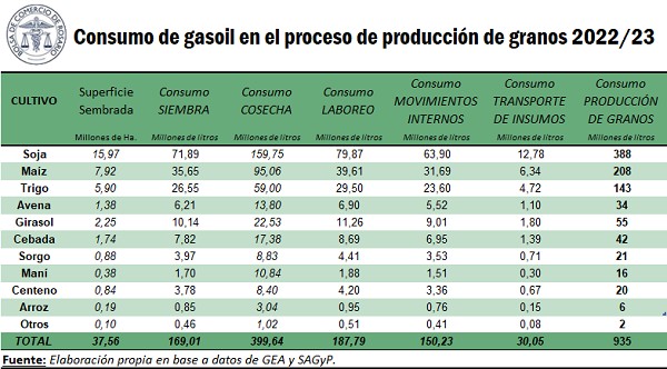 De este modo, el consumo de gasoil en el proceso productivo para la campaña 2022/23 podría ubicarse en 935 millones de litros, aproximadamente un 1% por debajo del consumo del ciclo 2021/22, resultado de una leve disminución en la superficie sembrada total.