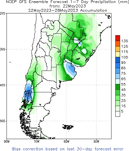 Mayo puede despedirse con lluvias muy importantes en gran parte de la región núcleo, y alcanzar a cubrir el 60 al 70% de la región pampeana. Esto es Buenos Aires, sur y centro de Santa Fe e incluso hay posibilidades de que las lluvias alcancen al sur y centro de Córdoba. Si bien se está visualizando en los modelos predictivos una mayor cantidad de agua, publicamos la salida de 22 al 28 de mayo de la NOAA como referencia.