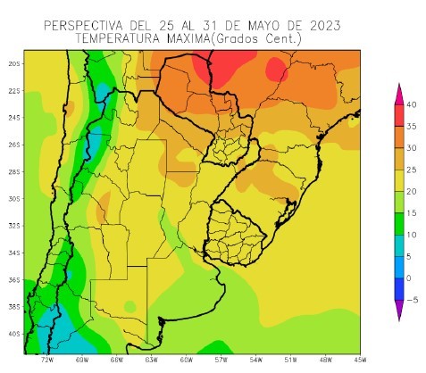 • La mayor parte del área agrícola argentina, el sudeste del área agrícola paraguaya y la República Oriental del Uruguay observarán temperaturas máximas superiores a 20°C con un amplio foco con valores superiores a 25 y 30°C, que se ubicarán hacia el norte y otros focos con valores inferiores.