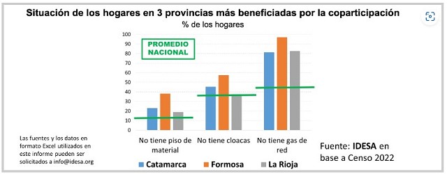 Dejando de lado Tierra del Fuego, las tres provincias más beneficiadas por la coparticipación son Catamarca, Formosa y La Rioja, en ese orden. Reciben, por habitante, casi 3 veces más que el promedio de las provincias. Pero, según el Censo 2022, se observa que: