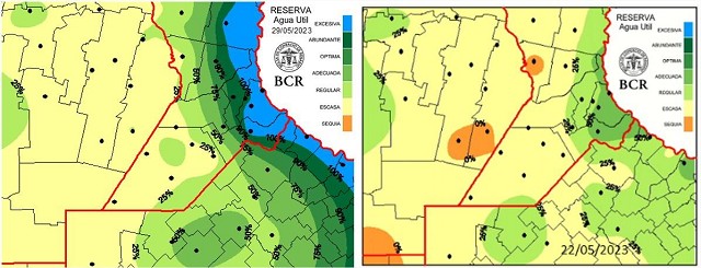 Hubo una situación similar dos años atrás (27 de mayo del 2021) clave para impulsar la siembra de trigo (siembra que se convertiría en record histórico de Argentina). Ese evento quebró la preponderancia de las lluvias por la franja este y dejó acumulados de más de 100 milímetros en el oeste. Lamentablemente, esto no sucedió en este mayo del 2023: la mejora solo llegó a la franja este de la región pampeana.