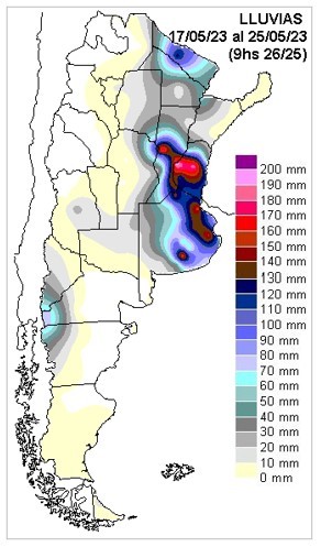 La gran dificultad que atravesaba la zona central para salir de la sequía, requería eventos pluviales difíciles de esperar en esta época del año. Sin embargo, la condición de humedad que se venía sosteniendo con mucha eficiencia desde el inicio de la segunda quincena de mayo, bajo la circulación de aire muy cálida y húmeda ha sido determinante y aún está presente. Esto permitió converger en un escenario muy favorable para que se concreten lluvias inusuales para estas fechas, lo cual permitió en vastas zonas compensar las deficiencias del mes de abril. Tomando todo el período, desde comienzos de abril, los acumulados pueden verse como normalizados por la estadística, sin embargo la concentración de las precipitaciones en apenas unos días, dista mucho de ser beneficiosa. Claro está, mejor que el agua haya llegado, pero también es reconocible el impacto negativo de esta notable sobreoferta de agua. La mirada más ventajosa se apoya en el hecho de que estos máximos pluviales aparecieron cuando aún no se había comenzado a sembrar.