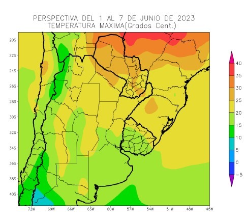 La primera etapa de la perspectiva comenzará con vientos del trópico produciendo un moderado ascenso térmico, sin superar los registros normales para la época, salvo algunos focos cálidos sobre el norte del área agrícola.