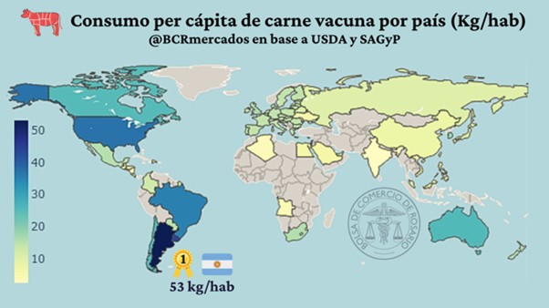 Pese a que el consumo de carne vacuna per cápita se encuentra en niveles cercanos a mínimos históricos, como se enfatizaba en este artículo del Informativo Semanal N° 2054, resulta importante recalcar que la Argentina todavía sigue siendo el principal consumidor de carne bovina por habitante a nivel mundial. En 2023 se estima un consumo de 53,1 kg por habitante, superando cómodamente a los dos países que continúan en el podio: Uruguay y Estados Unidos, donde el habitante promedio consumiría 43 y 37 kg, respectivamente. A continuación, siguen en el ranking Brasil (35,3 kg), Israel (27,2 kg), Chile (26,3 kg) y Australia (25,6 kg). Pese a todo, el tradicional asado continúa siendo uno de los pilares de la tradición gastronómica local, y un infaltable en la mayoría de las mesas argentinas.