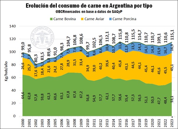 El consumo total de carnes bovina, aviar y porcina por habitante en Argentina podría ubicarse en torno a 115,2 kg en el año 2023. De ser así, representaría una mejora del 4,2% respecto al año anterior, y se alcanzarían niveles de consumo cercanos a los del año 2017. Por otra parte, cada habitante consumiría en 2023 un total de 4,0 y 3,4 kg por encima de los promedios de los últimos 5 y 10 años, respectivamente.