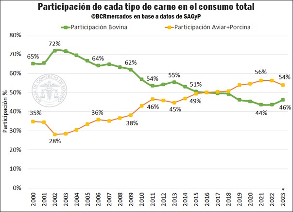 Puede observarse en el gráfico que desde el año 2002 la primera ha ido perdiendo representación en la canasta de consumo, siendo reemplazada por las otras dos fuentes de proteína animal, cuestión que ya ha sido analizada en ediciones previas del Informativo Semanal. En el 2016 el consumo bovino empardó con los sustitutos, y desde entonces representa menos de la mitad de toda la carne que se come anualmente en las mesas argentinas. Sin embargo, en los últimos 2 años la tradicional carne vacuna ha recuperado parcialmente su participación relativa, subiendo dos puntos.