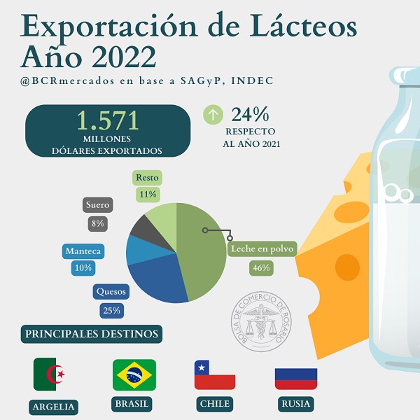 La leche en polvo representa el 46% del total exportado por el complejo, seguido por quesos con un 25% y en tercer lugar con un 10% manteca. Los principales destinos de exportación son Argelia, Brasil, Chile y Rusia.