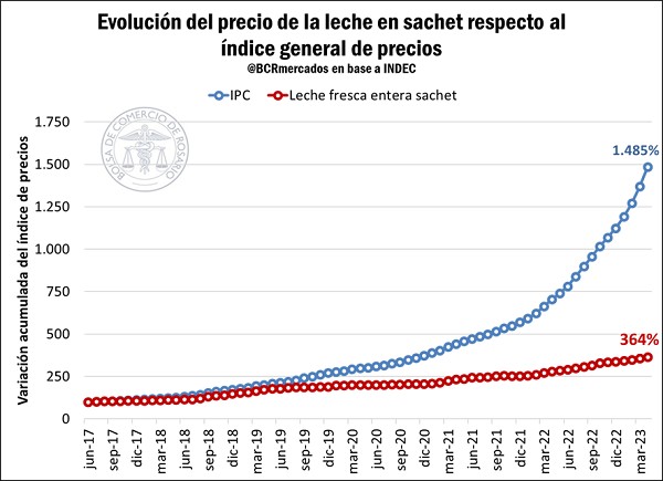 Respecto al precio de venta del producto terminado, las regulaciones que afectan la comercialización de leche, por el fuerte impacto que tienen en la canasta básica, han determinado que el incremento en el precio del litro de leche entera en sachet quede por debajo del incremento general de precios de la economía, medido según el Índice de Precios al Consumidor (IPC). En efecto, en base a la información publicada por el Instituto Nacional de Estadística y Censos de la República Argentina (INDEC), y tomando como base el mes de junio de 2017 (jun 2017 = 100), desde entonces y hasta abril de 2023 el índice general de precios (IPC) acumula un alza del 1.385%, en tanto que en el mismo período el sachet de leche entera subió 1.185%. Ello es, 200 puntos porcentuales menos que el promedio ponderado de precios del resto de la economía.