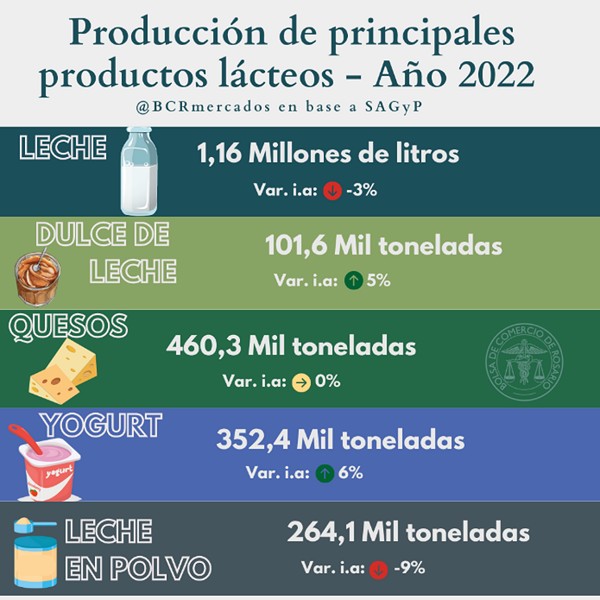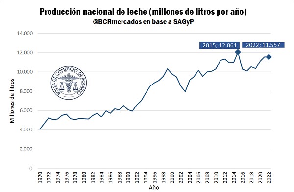 La producción primaria de leche en el año 2022 fue de 11.557 millones de litros, prácticamente estable respecto de los 11.553 litros del año 2021 aunque, aun así, se destaca como la más alta desde el año 2015. En los últimos dos años se ha intensificado la actividad primaria con el uso de suplementos, mejoras genéticas, tecnológicas y prácticas de manejo en el tambo.