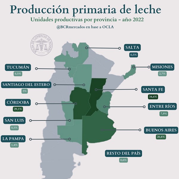 La provincia de Santa Fe en particular encabeza el ranking nacional en cantidad de tambos en el año 2022, concentrando el 35% de las unidades de producción primaria de leche. Le sigue en el podio Córdoba, con un 29% del total, y Buenos Aires, que concentra el 21%. Las tres provincias reúnen así -en conjunto- el 85% de las unidades primarias de producción, según datos del Observatorio de la Cadena Láctea Argentina (OCLA).
