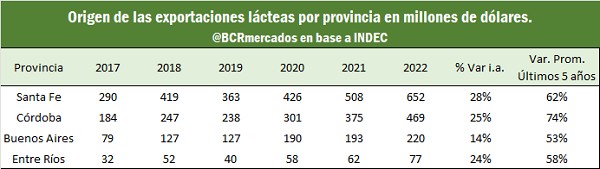 En cuanto a valor exportado, la provincia de Santa Fe lidera el ranking entre las principales provincias exportadoras del complejo. Se destaca que la provincia de Córdoba ha tenido un gran crecimiento en sus exportaciones, donde la variación de lo exportado en el año 2022 con respecto al promedio de los últimos 5 años arroja un crecimiento del 74%.
