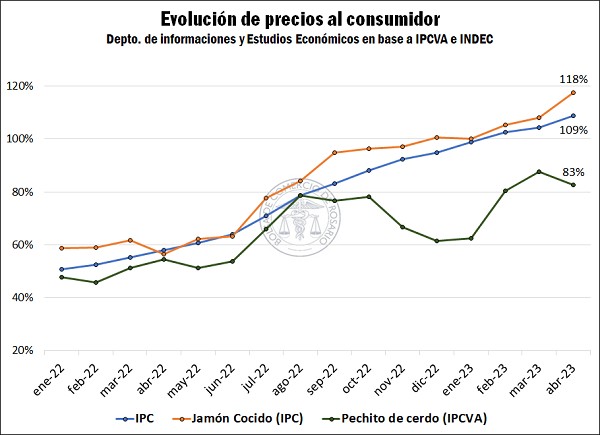 Por el lado de los fiambres, se advierte que el precio del jamón cocido, cuya evolución mide el INDEC (compone la canasta de bienes cuya evolución mide el Índice de precios al Consumidor), ha tendido a crecer por encima de la inflación de forma casi ininterrumpida desde comienzos de 2022, mostrando un incremento del 118% interanual para el mes de abril.