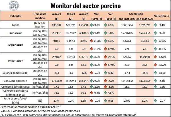 Según las proyecciones del Departamento de Agricultura de los Estados Unidos (USDA), y en consonancia también con la dinámica que viene exhibiendo la producción en lo que va de 2023, Argentina se encamina a batir un récord este año, pudiendo alcanzar la producción de 760.000 toneladas de carne (res c/ hueso equivalente). En el primer cuatrimestre de este año, se faenaron 2,56 millones de cabezas de porcinos, alcanzando una producción cercana a 240.000 toneladas de carne; esto se ubica ya un 7% por encima del mismo período de 2022 y marca un máximo histórico para un primer cuatrimestre de año.