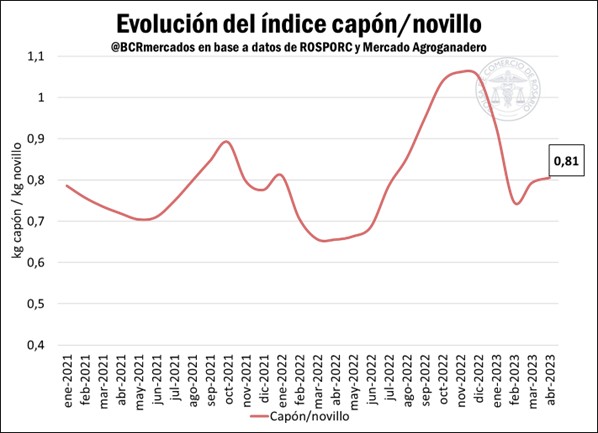 El precio de la carne bovina es un indicador muy seguido por el sector porcino, dado que fija un techo teórico de venta para su producto que, si bien puede llegar a traspasarse en un momento dado, terminará oficiando como una dura resistencia para subas ulteriores. Luego de un final de 2022 en el que el precio del capón llegó a superar al precio del novillo (considerando los promedios mensuales de noviembre y diciembre), esta relación sintió una corrección en los primeros meses de 2023 en favor de los bovinos. La fuerte suba en el precio del novillo en enero (+15%) y fundamentalmente el salto de febrero (+32%) devolvieron a la relación por debajo de la unidad. En los meses de marzo y abril, la relativa estabilidad en el precio del novillo permitió una tímida ganancia de posición del capón, que cerró el cuarto mes del año con un promedio del 0,80 en relación con el novillo.